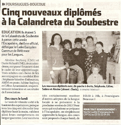 Felicitacions a Alexine e Danis (calandrons), Sabine (dinerèra), Stéphanie (ASEM) e Céline (secretària) que s'i son escaduts tau diplòma A2 d'Escapolaire !